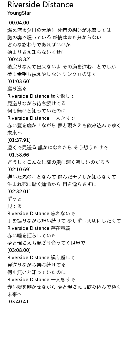 | [01:06.37] | Riverside Distance zǎo fǎn |