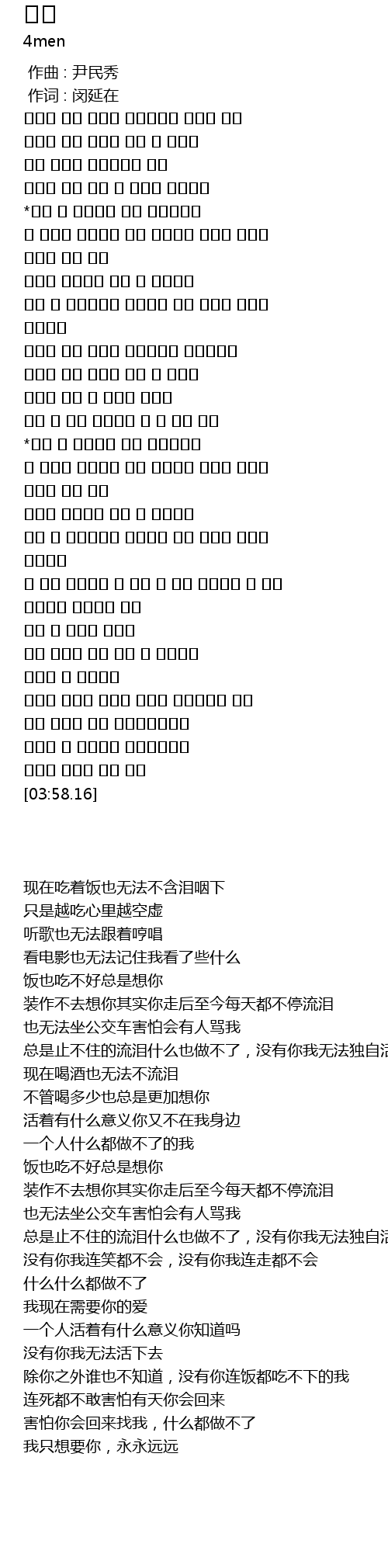 니 생각에 체할까봐 니가 떠난후로 오늘도 눈물로 하루를 먹고 살아 |