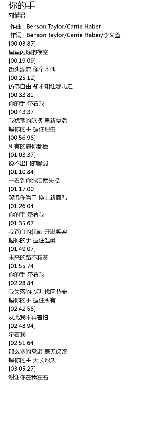 | [01:43.17] | wò nǐ de shǒu wò zhù wēn róu |