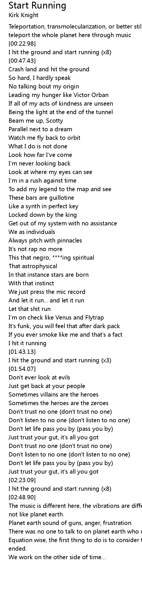 | [02:23.36] | I hit the ground and start running (x8) |