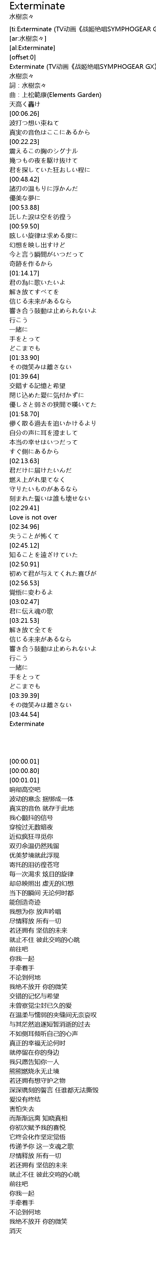 | [00:00.01] | Exterminate (TV动画《战姬绝唱SYMPHOGEAR GX》片头曲) - 水樹奈々 |