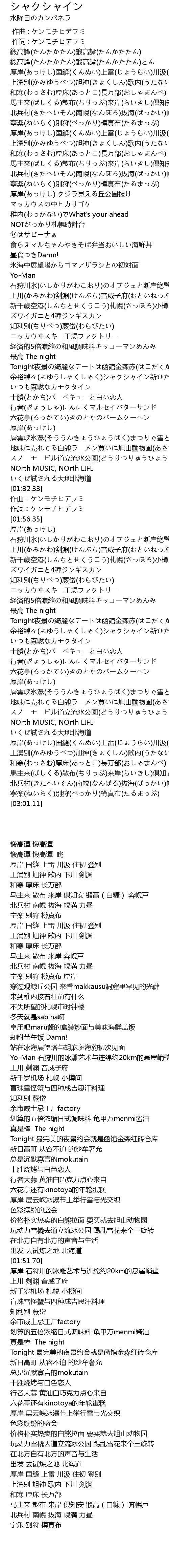 | [02:53.70] | 馬主来(ばしくる)散布(ちりっぷ)来岸(らいきし)倶知安(くっちゃん)鍛高(たんたか)奔幌戸(ぽんぽろと) |