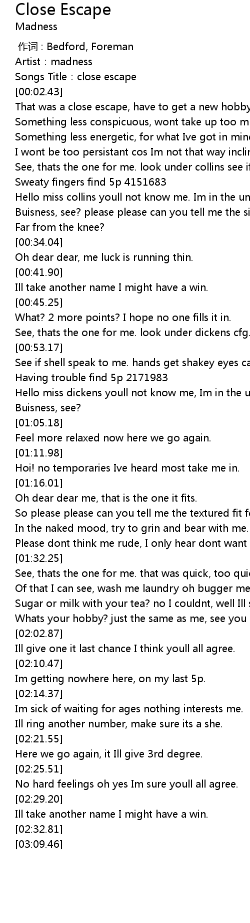 | [00:01.13] | Songs Title: close escape |