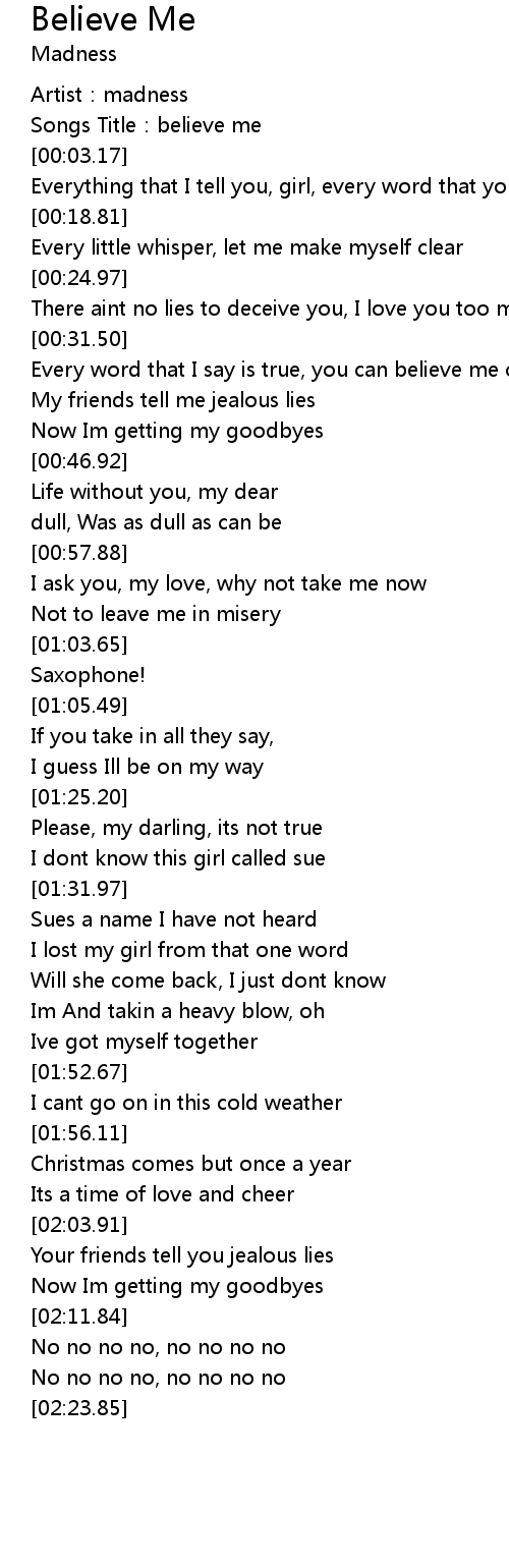 | [00:32.75] | Every word that I say is true, you can believe me on that |