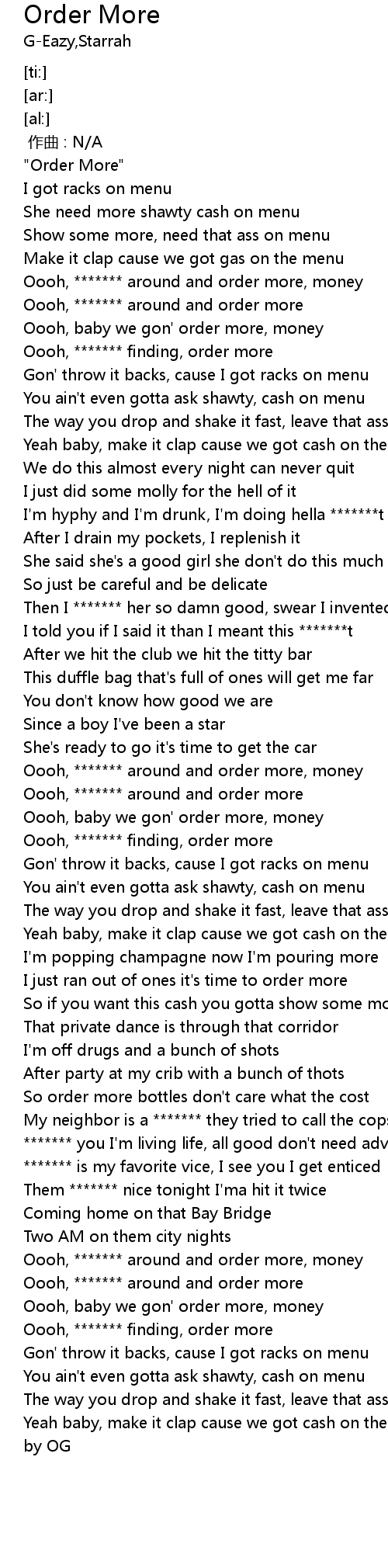 | [01:36.06] | Oooh, ******* around and order more, money |
