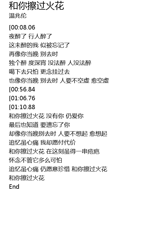 | [01:19.81] | 和你擦过火花 没有你 仍爱你 |