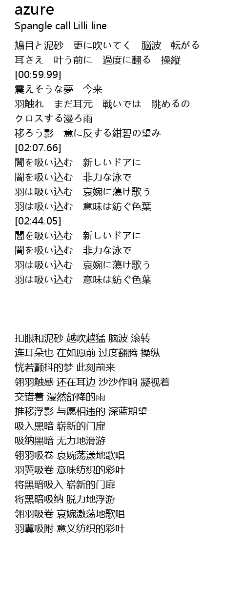 | [01:58.05] | 移ろう影 意に反する紺碧の望み |