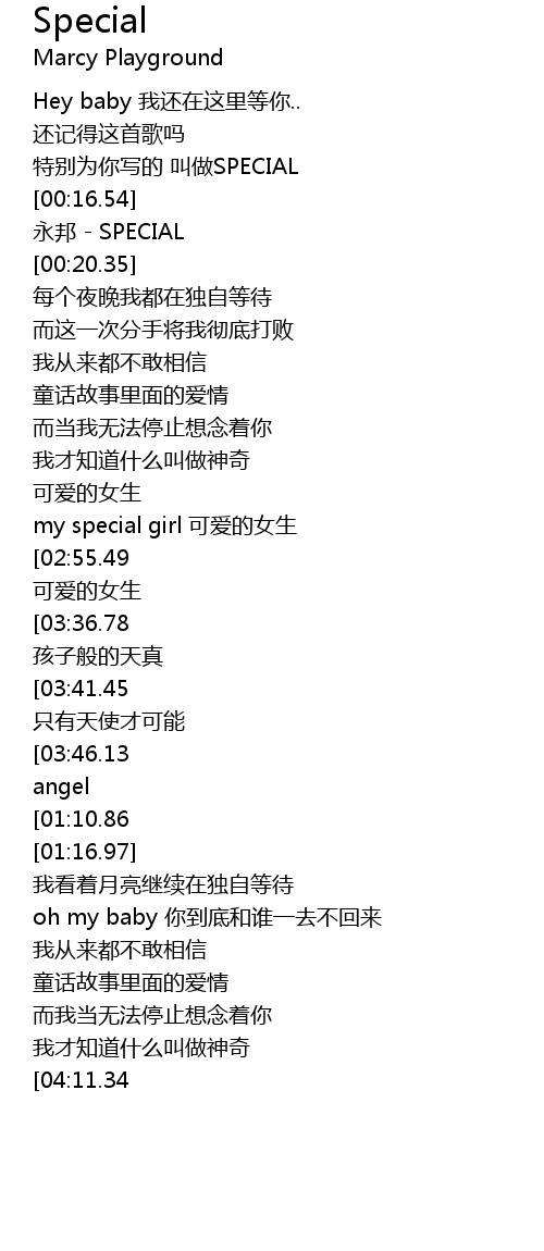 | [03:14.34][02:55.49][02:18.06][01:59.96][00:57.39] | You're my special girl 可爱的女生 |