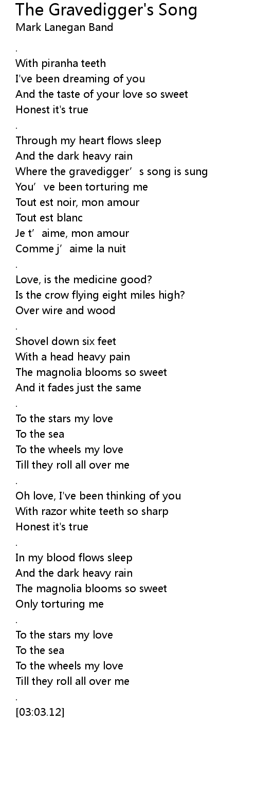 | [00:30.35] | Where the gravedigger’s song is sung |