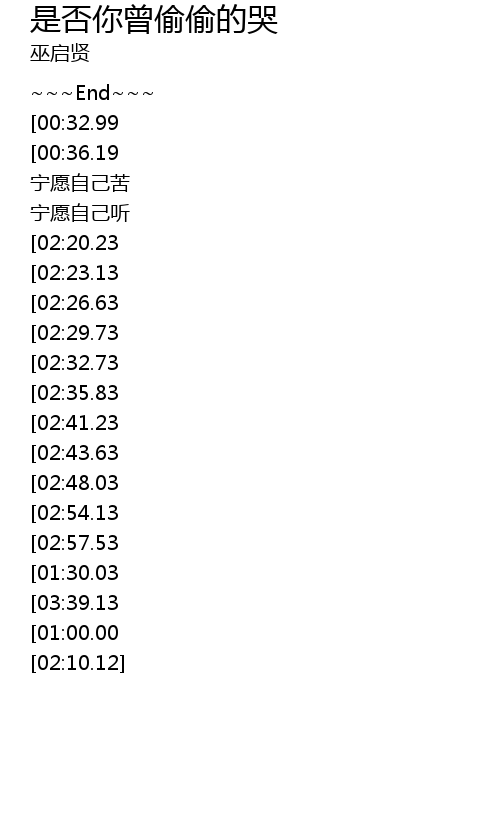 | [00:19.80][00:32.99][02:13.12] | 是否你曾偷偷的哭 |