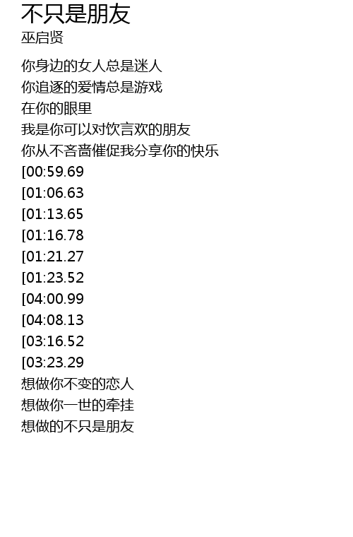 | [04:30.47][04:00.99][03:01.95][01:30.95] | 你从不知道我想做的不只是朋友 |