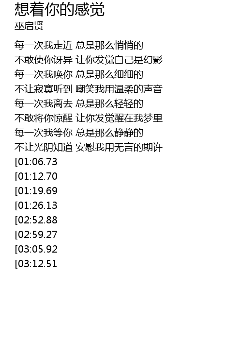 | [03:32.65][03:05.92][01:45.45] | 想着你的感觉 有如风的缱绻 |