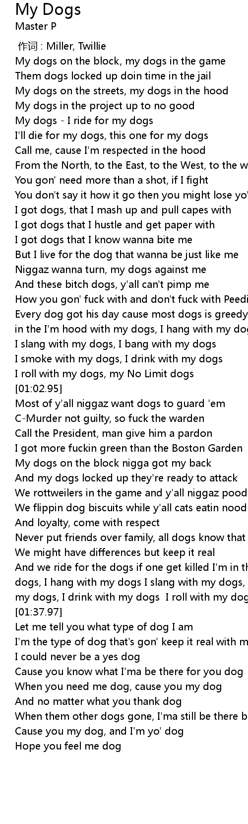 | [01:35.79] | And we ride for the dogs if one get killed I' m in the hood with my dogs, I hang with my dogs I slang with my dogs, I bang with my dogs I smoke with my dogs, I drink with my dogs I roll with my dogs, my No Limit dogs |