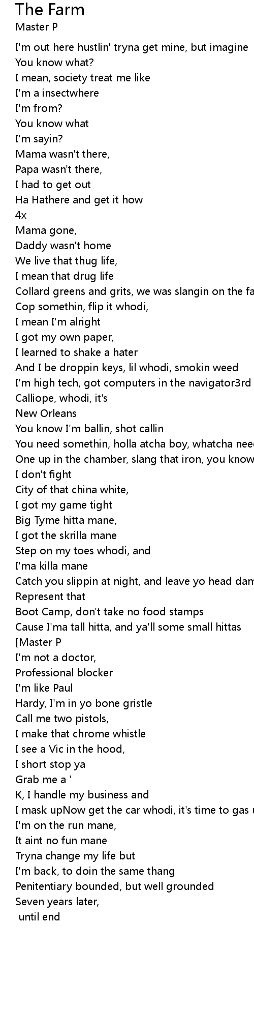 | Collard greens and grits, we was slangin on the farm[Master P] | |