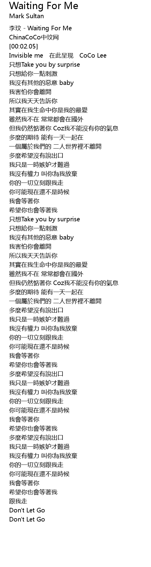 | [00:02.78] | Invisible me 在此呈现 CoCo Lee |
