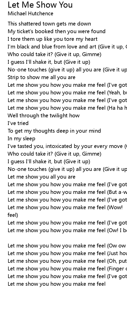 | Let me show you how you make me feel (Ow! I bet how you’re gonna make me feel) | |