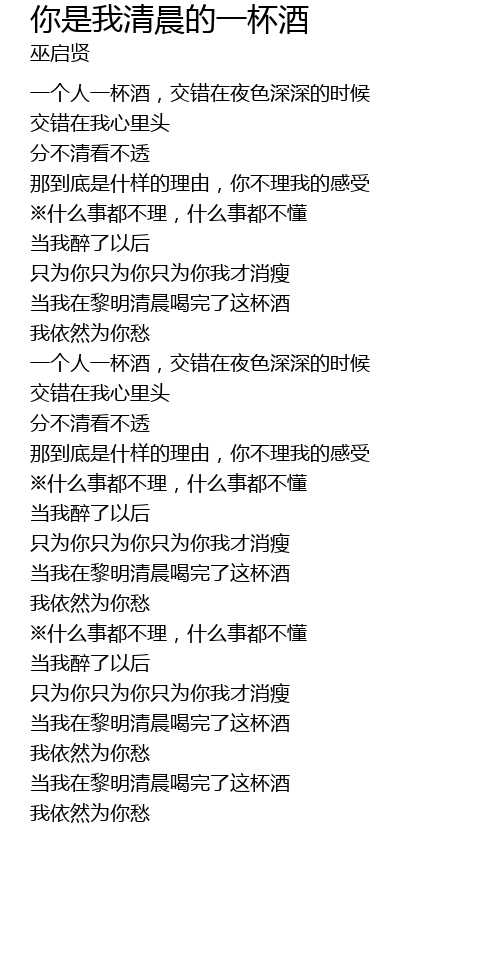| [02:32.35] | dang wo zai li ming qing chen he wan le zhe bei jiu |