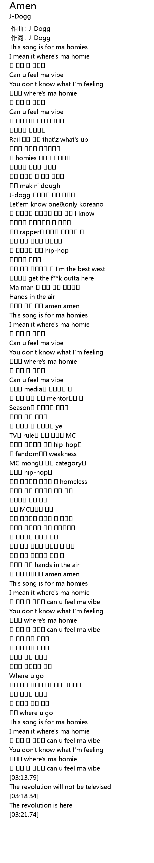 | [01:16.64] | 그리고 같이 외쳐 amen amen |