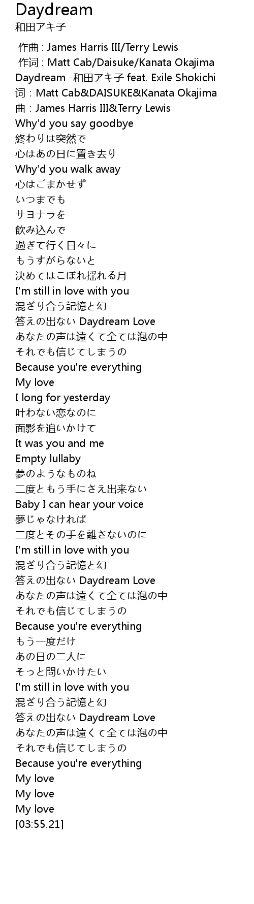 | [00:00.70] | Daydream -和田アキ子 feat. Exile Shokichi |