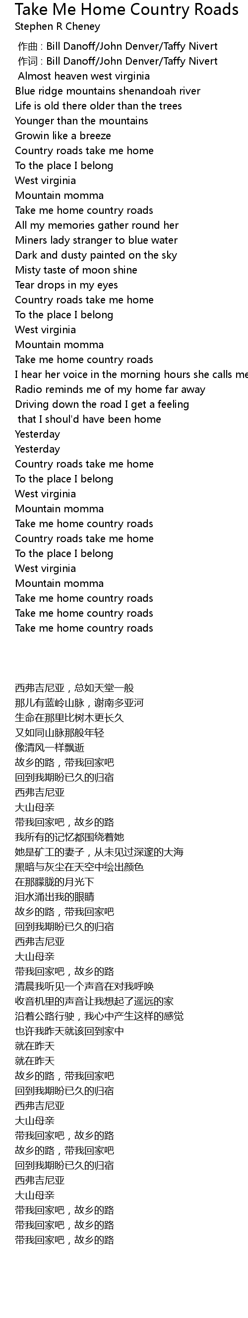 | [00:01.00] | 作词 : Bill Danoff/John Denver/Taffy Nivert |