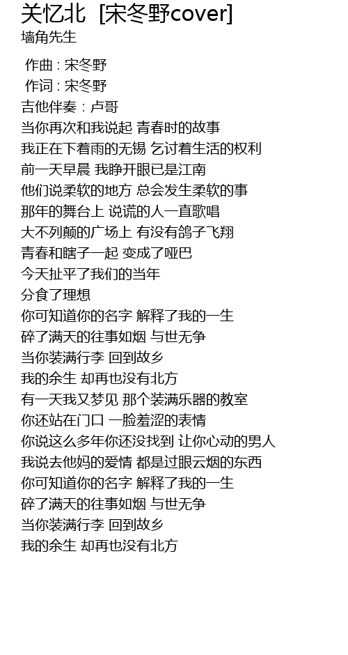 | [01:55.28] | 我的余生 却再也没有北方 |