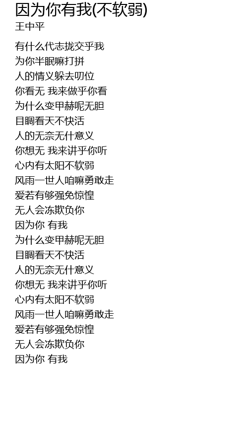 | [01:38.539] | yīn wèi nǐ yǒu wǒ |