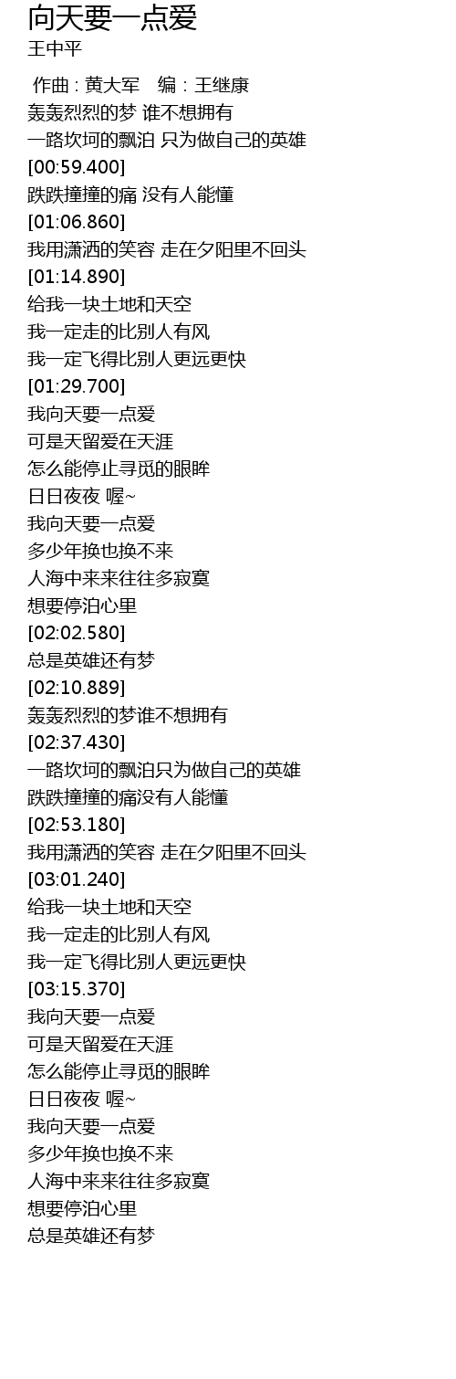 | [01:45.539] | wǒ xiàng tiān yào yì diǎn ài |