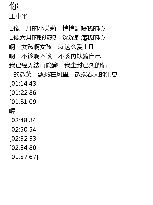 | [02:09.92][01:14.43] | a nǚ hái a nǚ hái wú fǎ tíng zhǐ xiǎng nǐ |