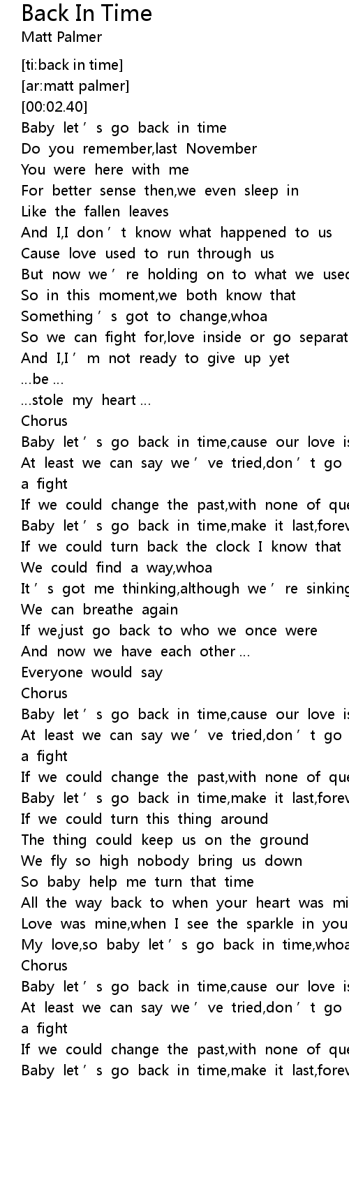 | [02:29.82] | Baby let ' s go back in time, cause our love is on the line |