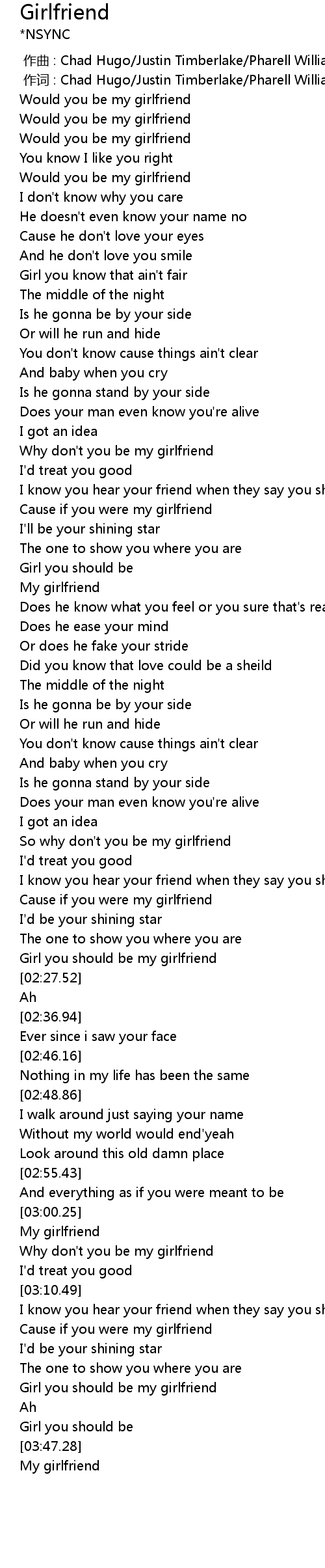 | [03:25.53] | Girl you should be my girlfriend |