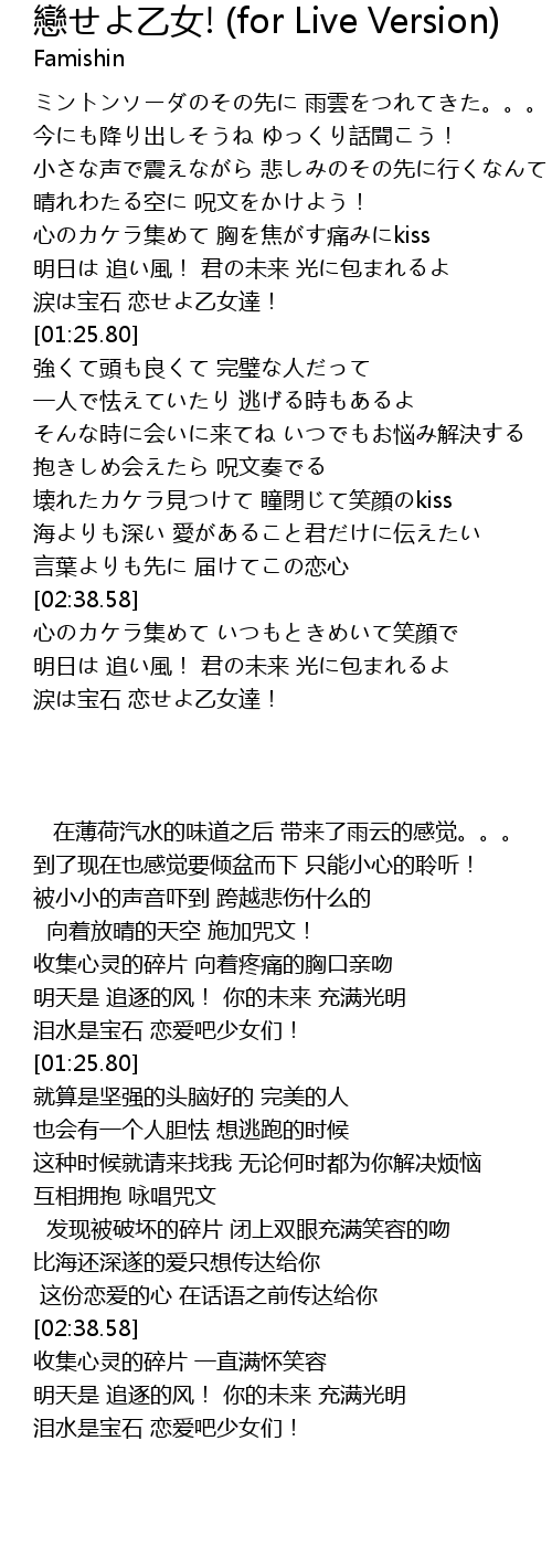 | [01:15.53] | 涙は宝石 恋せよ乙女達! |
