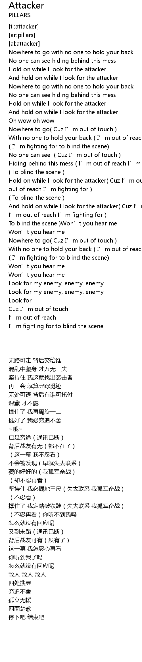 | [02:02.42] | Hold on while I look for the attacker Cuz I' m out of touch I' m out of reach I' m fighting for |