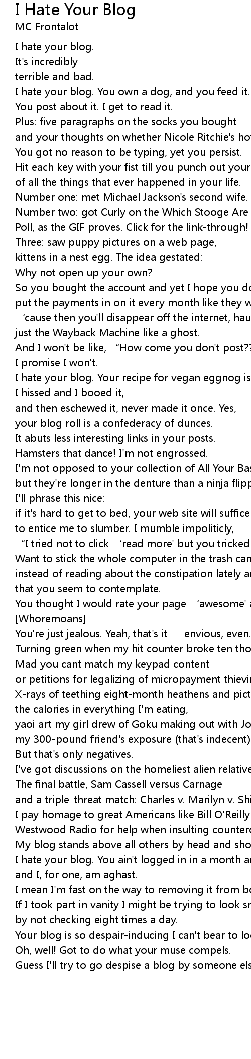 | I hate your blog. You ain't logged in in a month and a half, | |