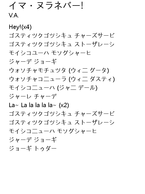 | [00:17.40] | ウォソチャモチュツタ (ウィ二 グータ) |
