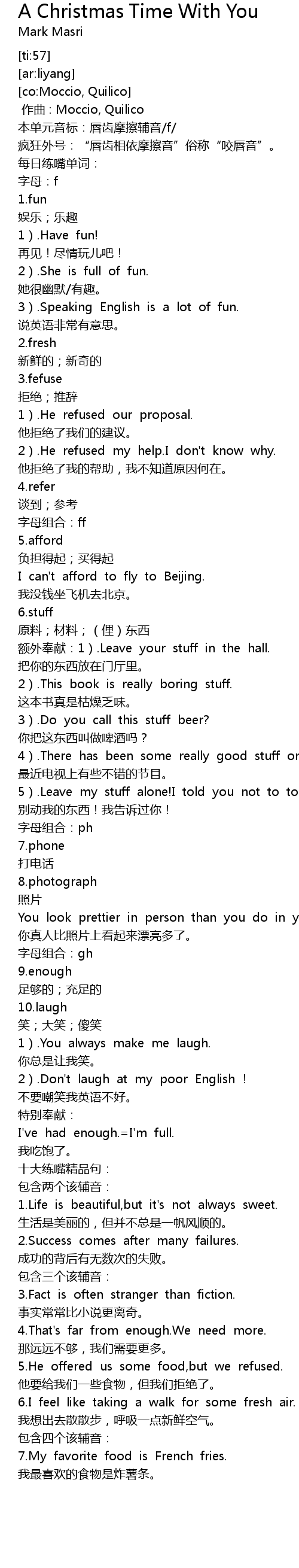 | [00:10.14] | 疯狂外号:“唇齿相依摩擦音”俗称“咬唇音”。 |