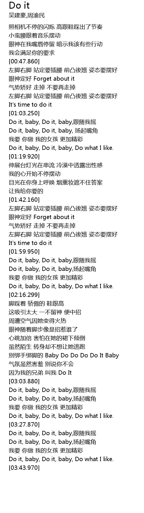 | [03:28.370] | Do it, baby, Do it, baby, gēn suí wǒ yáo |
