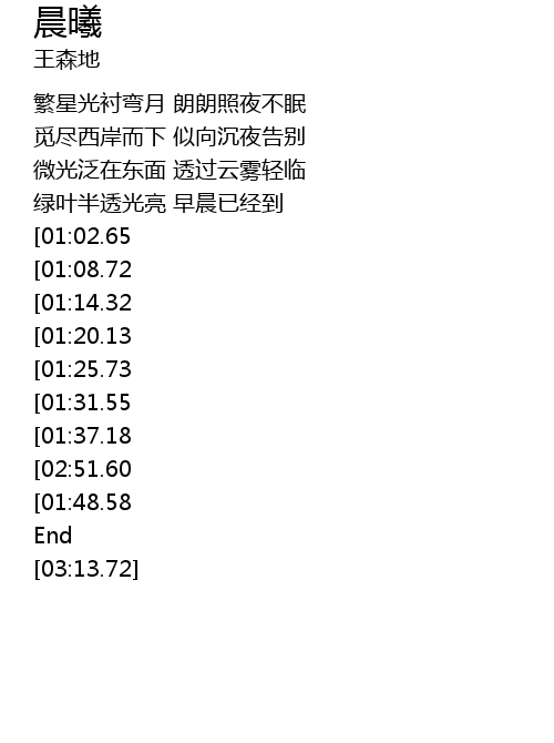 | [02:11.43][01:02.65] | 晨曦的光辉 把天擦亮 |