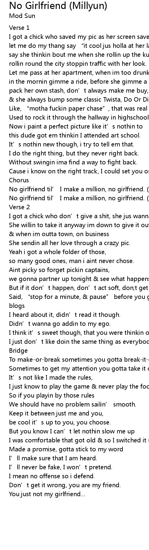 | No girlfriend til' I make a million, no girlfriend. I don' t need one | |