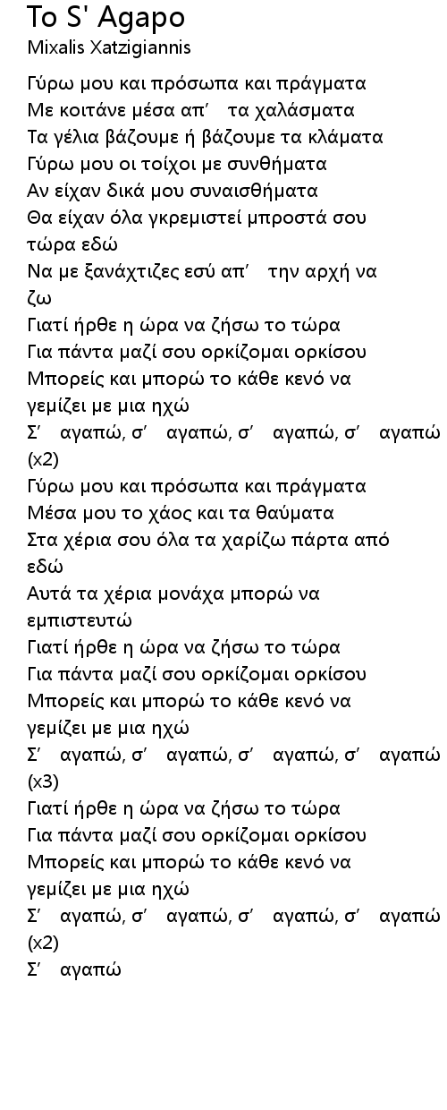 Σ’ αγαπώ, σ’ αγαπώ, σ’ αγαπώ, σ’ αγαπώ (x2) |