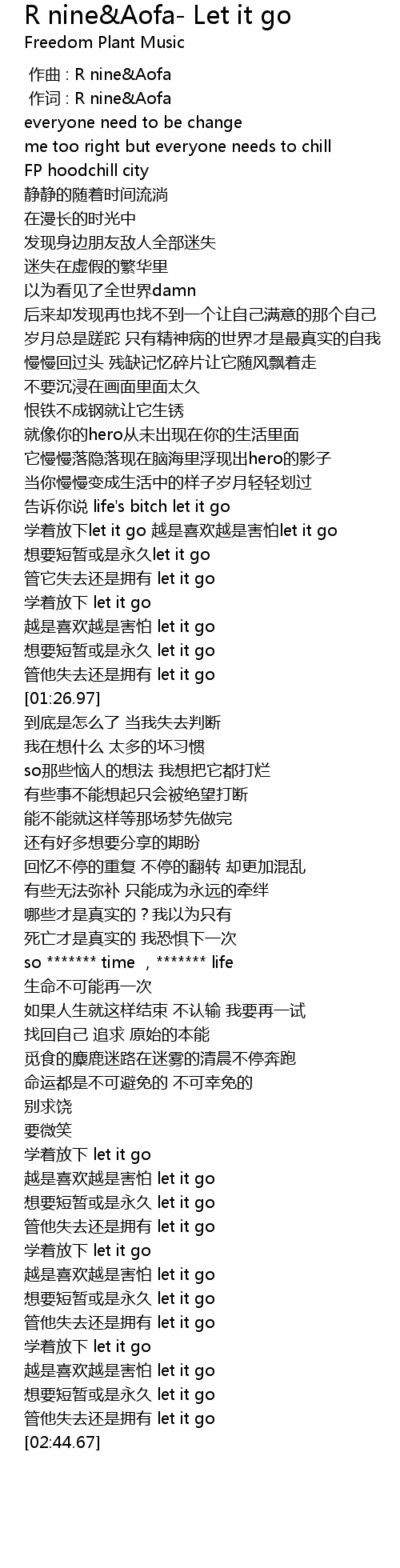 | Song | R nine&Aofa- Let it go |