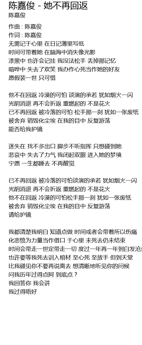 | Song | 陈嘉俊 - 她不再回返 |