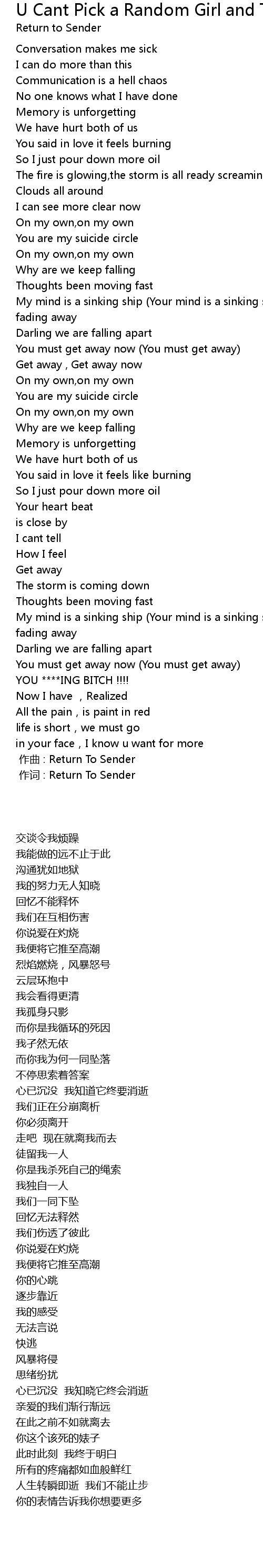 | Song | U Cant Pick a Random Girl and Throw Her Away, It Will Eat U Alive |