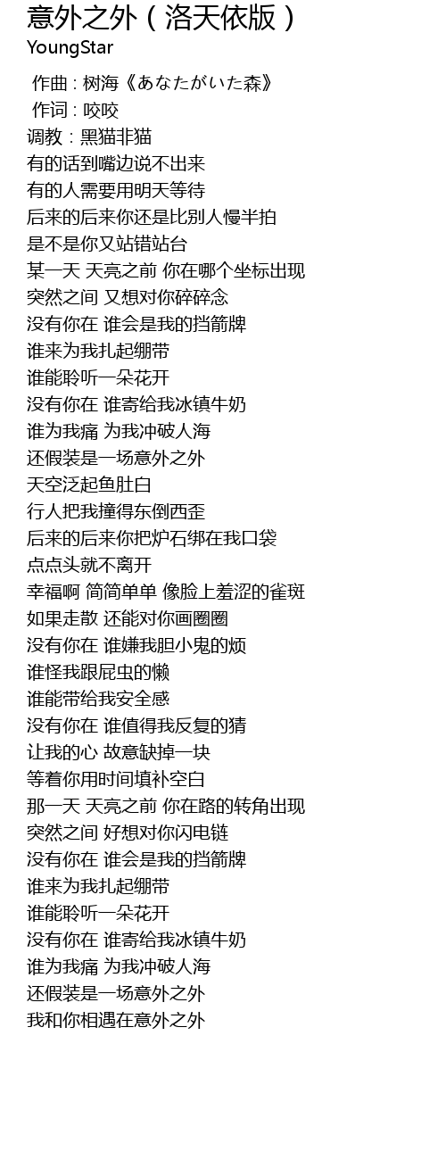 | [03:45.83] | wǒ hé nǐ xiāng yù zài yì wài zhī wài |