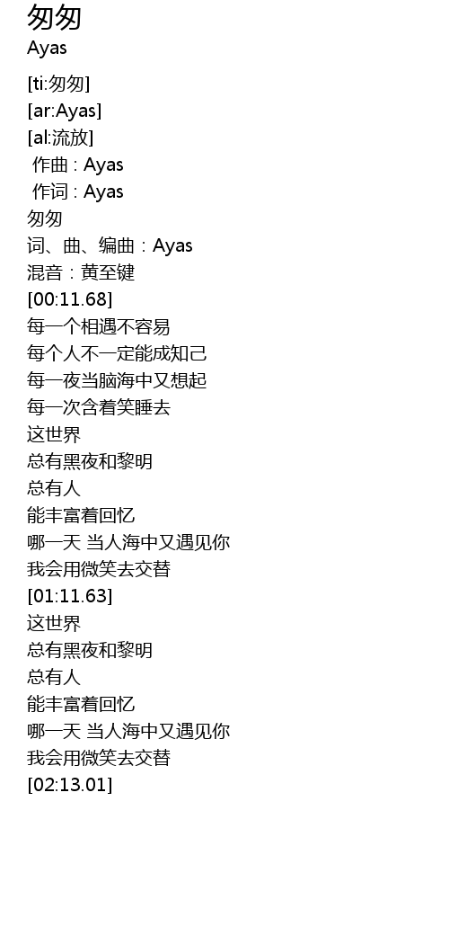 | [00:04.45] | 词、曲、编曲:Ayas |