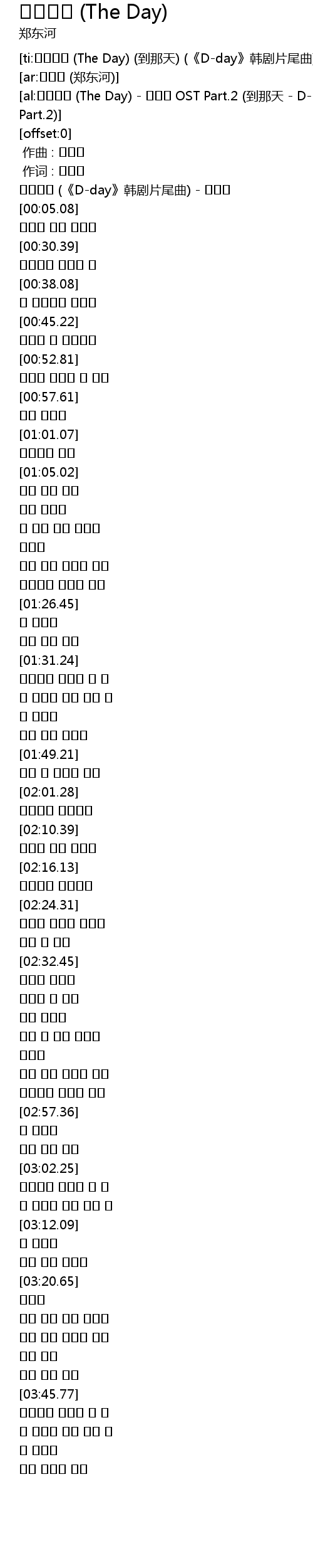 | [00:00.34] | 그날까지 (《D-day》韩剧片尾曲) - 정동하 |