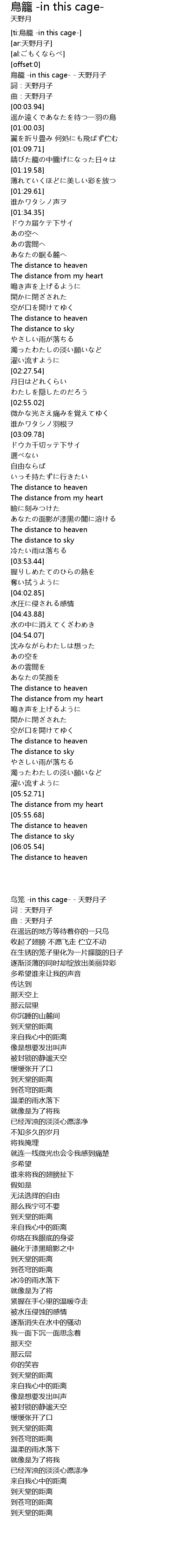 | [00:00.21] | 鳥籠 -in this cage- - 天野月子 |