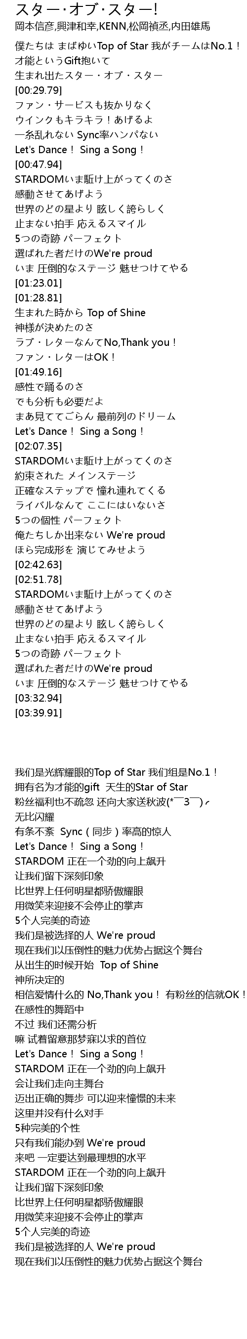 | [00:15.52] | 僕たちは まばゆいTop of Star 我がチームはNo.1! |