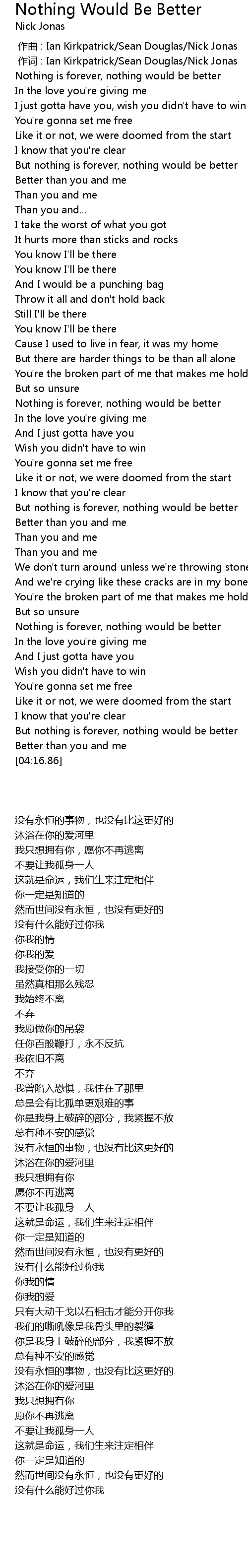 | [00:00.343] | zuò cí : Ian Kirkpatrick Sean Douglas Nick Jonas |
