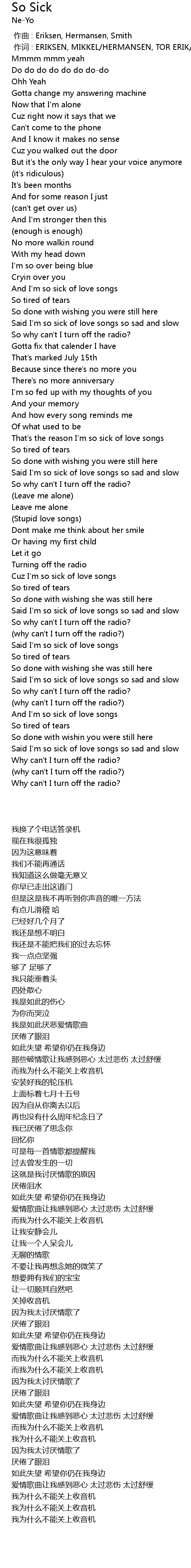 | [01:40.610] | That's the reason I'm so sick of love songs |