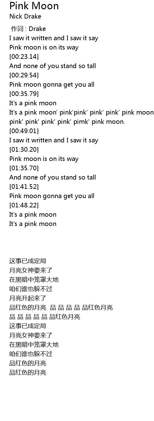 | [00:41.66] | It's a pink moon' pink'pink' pink' pink' pink moon. |